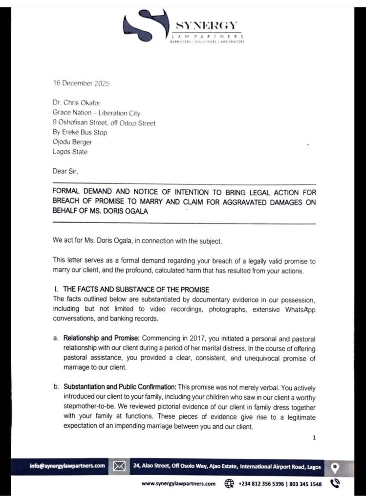Nollywood actress Doris Ogala has reportedly demanded ₦1,000,000,000.00 in compensation from Pastor Chris Okafor, accusing him of emotional damage and personal loss in a lawsuit that is already stirring intense public debate. According to the suit, Ogala claims the cleric consistently promised to marry her, introduced her to his family from the very beginning of their relationship, and convinced her of a future together.