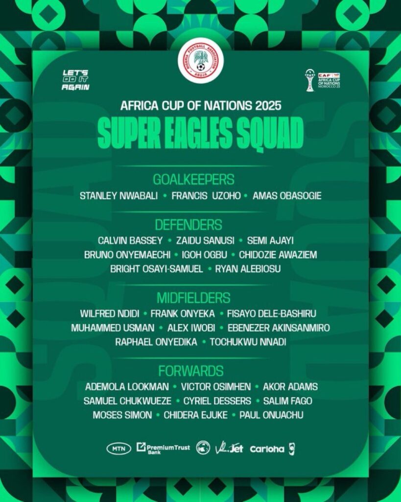 Despite the exclusions, some familiar names have secured their place on the plane to Morocco. Francis Uzoho retains his spot among the goalkeepers, while strikers Cyriel Dessers and Paul Onuachu have also been included, strengthening Nigeria’s attacking options. The selections signal Chelle’s intent to inject fresh energy and reassert his tactical identity as the competition draws near.