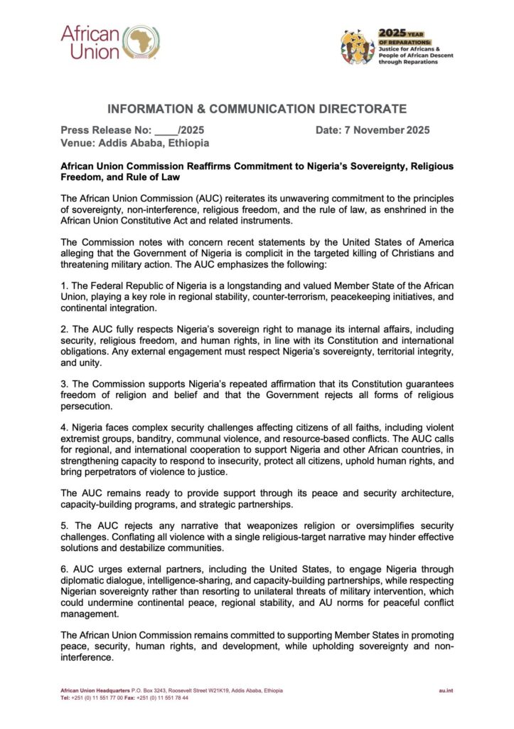 The African Union Commission (AUC) has reaffirmed its unwavering commitment to upholding the sovereignty of the Federal Republic of Nigeria, as well as the principles of religious freedom, democracy, and the rule of law.