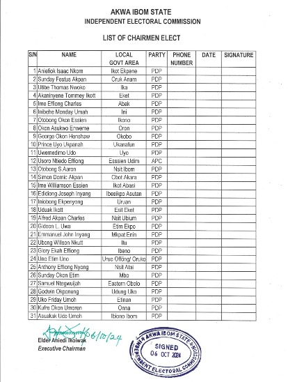 The Akwa Ibom State Independent Electoral Commission (AKISIEC) announced the results of the Local Government elections held on October 5, revealing that the All Progressives Congress (APC) secured victory in one local government area. The announcement was made on Sunday, confirming the successful conduct of the elections.
