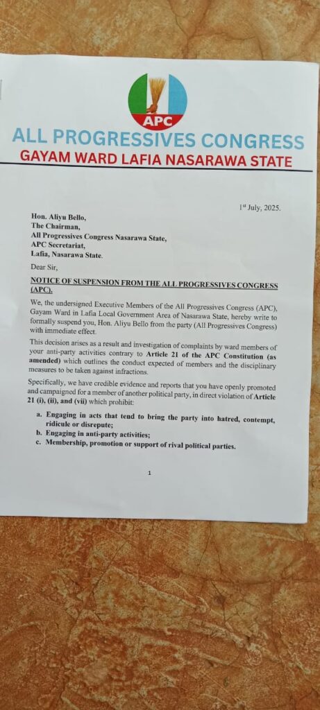 The political landscape in Nasarawa State took a dramatic turn Tuesday as the Chairman of the All Progressives Congress (APC) in the state, Aliyu Bello, was suspended by party executives in his ward over allegations of anti-party activities.