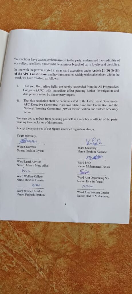 “In line with the powers vested in us as ward executives under Article 21 (D) (i)-(iii) of the APC constitution… we have resolved that you, Hon. Aliyu Bello, are hereby suspended from the All Progressives Congress (APC) with immediate effect,” Ilyasu declared.