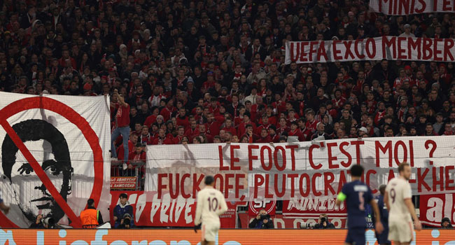 The banners, unveiled by a section of Bayern’s supporters, included profanity aimed at Al-Khelaifi and a graphic of his face crossed out. Additional messages criticized his numerous roles in football, stating, “Minister, club owner, TV rights holder, UEFA EXCO member & ECA chairman all in one.”