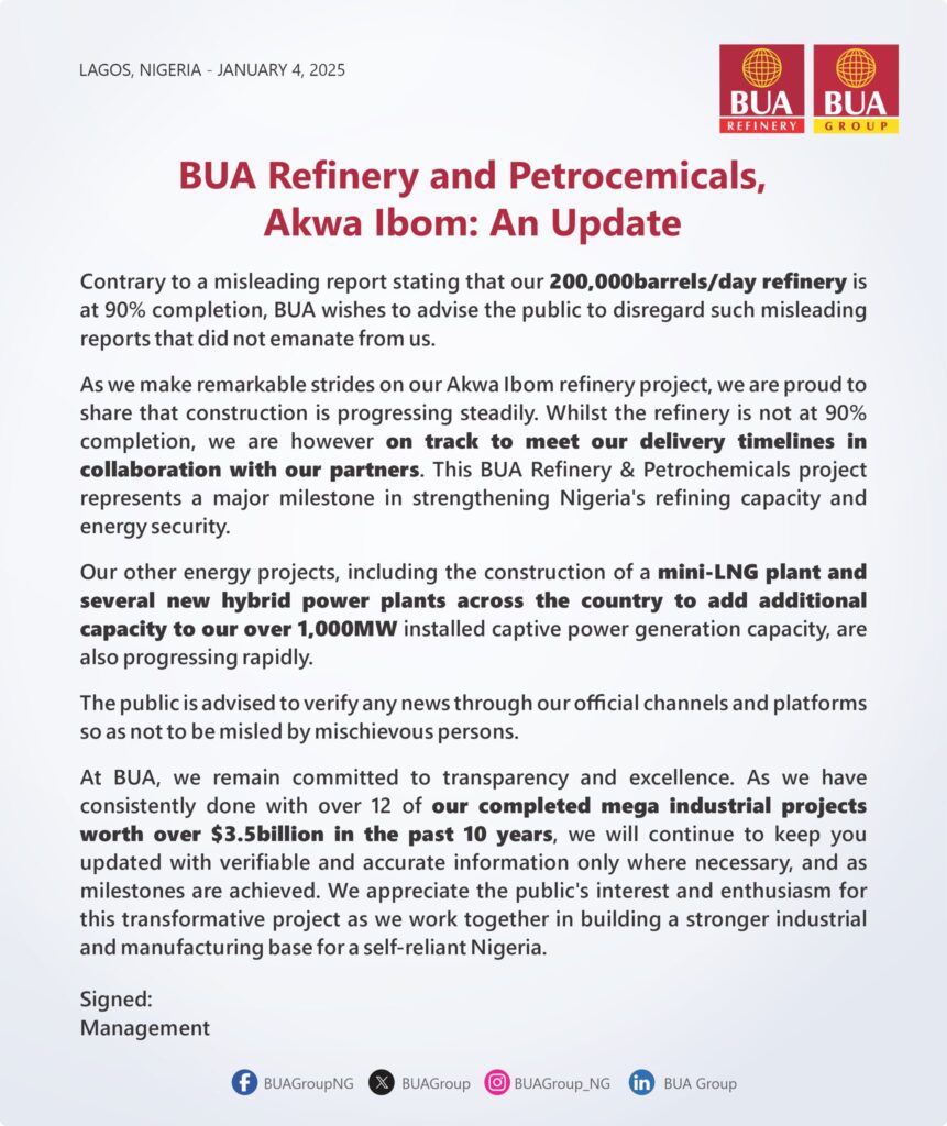 BUA Group has addressed a misleading report regarding the progress of its Akwa Ibom refinery project, clarifying that while the refinery is not 90% complete, construction remains on schedule. The company emphasized that all updates should be obtained through its official channels to avoid misinformation.