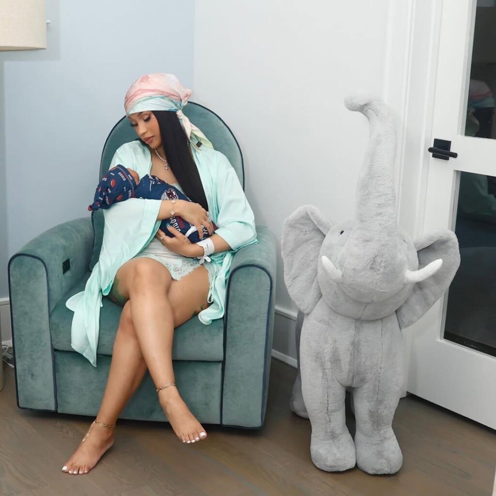 In the adorable slideshow, Cardi showed some extra love for her boyfriend by wrapping the baby in a New England Patriots swaddle emblazoned with the team logo and “DIGGS” across it. One photo captured a tender family moment, with Cardi and Stefon snuggling their son together after delivery, celebrating the start of this new chapter in their lives.
