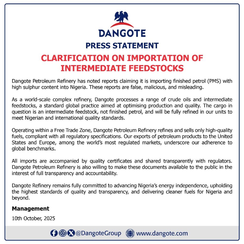 A Certificate of Quality issued by Phillips 66 Limited in the UK confirmed that the product shipped on September 21, 2025, was indeed an intermediate feedstock — not retail-grade petrol. The refinery further expressed its readiness to make all quality certificates public to ensure full transparency. Reaffirming its mission, Dangote Petroleum Refinery said it remains committed to advancing Nigeria’s energy independence, maintaining top-tier fuel quality, and delivering cleaner energy solutions to both local and international markets.