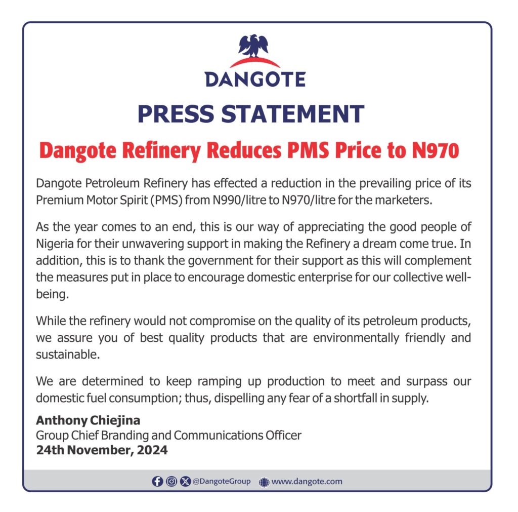 In a notable development for Nigeria’s petroleum industry, Dangote Petroleum Refinery has announced a reduction in the price of Premium Motor Spirit (PMS) from ₦990 to ₦970 per litre for marketers. This decision, unveiled through a press statement on November 24, 2024, is seen as a gesture of gratitude towards Nigerians for their steadfast support in realizing the refinery’s vision.