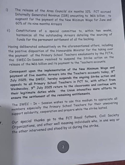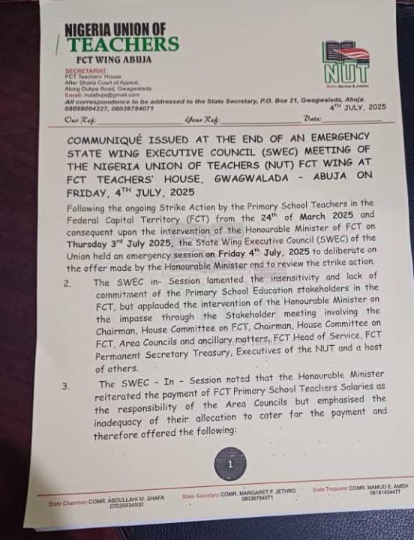 The Federal Capital Territory (FCT) Wing of the Nigerian Union of Teachers (NUT) has officially suspended the industrial action embarked upon by primary school teachers in the territory since March 24, 2025.