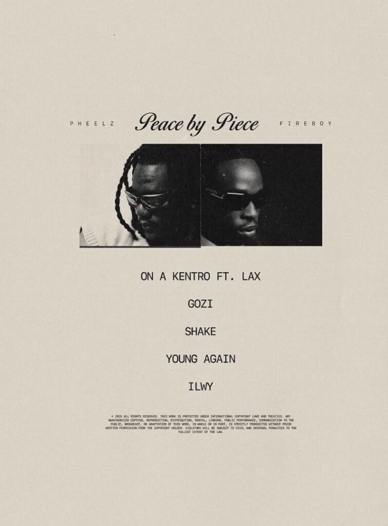 Known for their seamless chemistry and hit-making prowess, Fireboy and Pheelz promise a project packed with vibrant sounds and heartfelt lyrics. The “Peace by Piece” EP is expected to showcase their musical versatility, with tracks that range from energetic anthems to smooth, introspective tunes.
