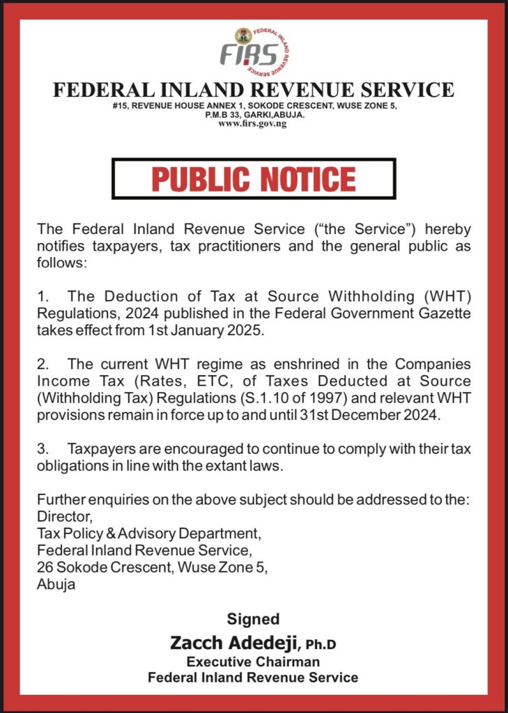 The Federal Inland Revenue Service (FIRS) has issued a public notice regarding new regulations on the deduction of tax at source. According to the announcement, the “Withholding Tax Regulations, 2024,” which were published in the Federal Government Gazette, will come into effect on January 1, 2025.