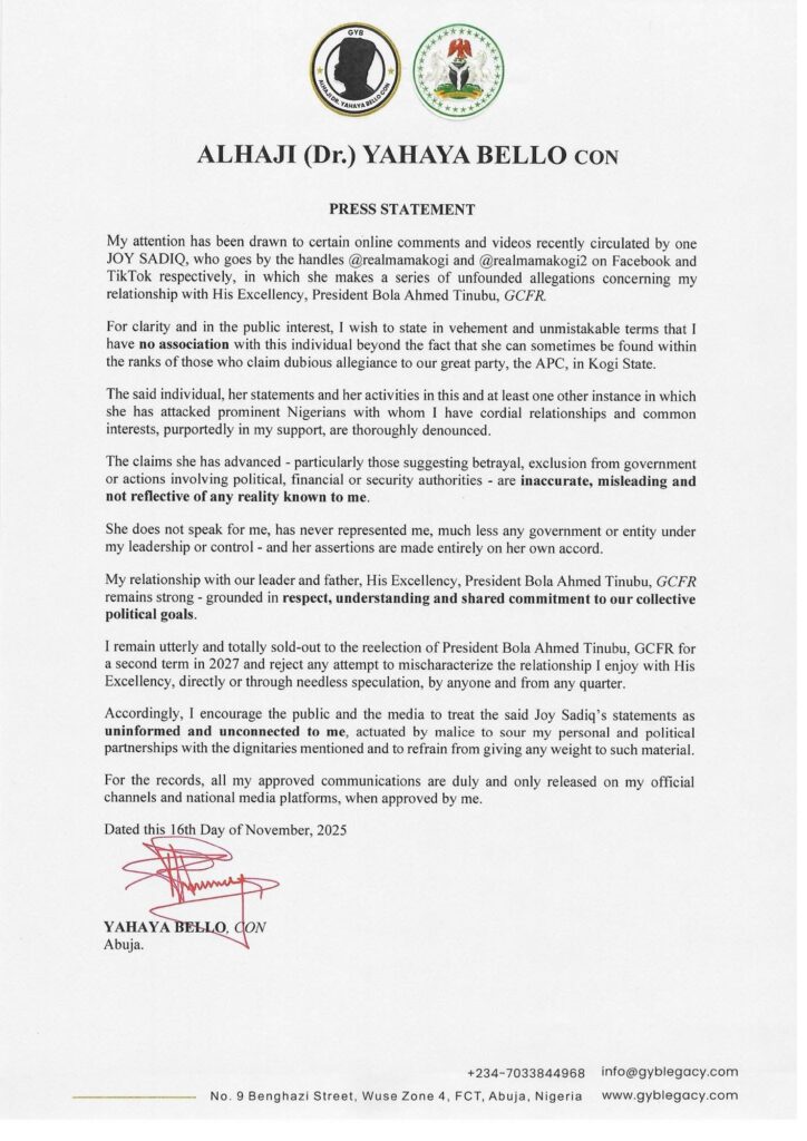 Former Kogi State Governor, Alhaji (Dr.) Yahaya Bello, CON, has issued a strong statement distancing himself from online claims circulated by one Joy Sadiq, who operates under the handles @realmamakogi and @realmamakogi2 on Facebook and TikTok.