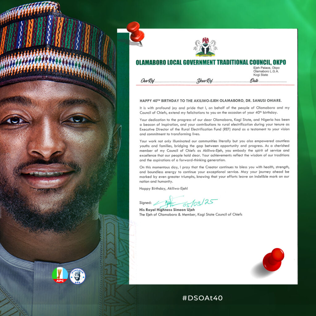 It is with profound joy and pride that I, on behalf of the people of Olamaboro and my Council of Chiefs, extend my felicitations to you on the occasion of your 40th birthday.