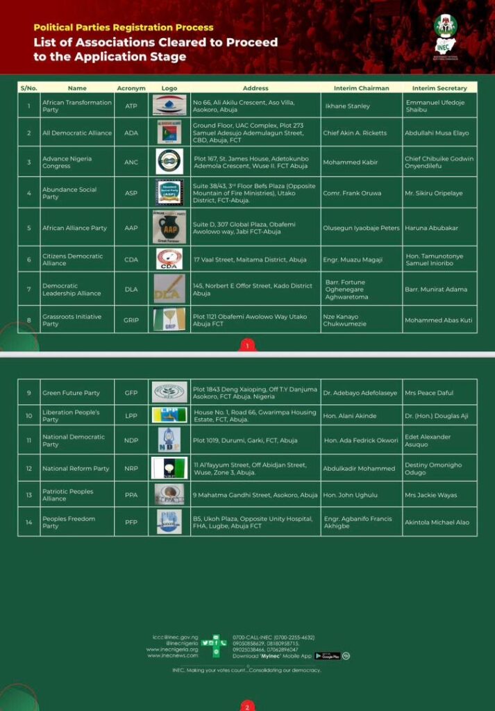 The Independent National Electoral Commission (INEC) has announced that 14 associations seeking political party status have met the preliminary requirements to proceed to the next stage of registration. The announcement followed the Commission’s regular meeting held on Thursday, during which a total of 171 applications were reviewed for compliance with the Constitution, the Electoral Act 2022, and the Commission’s Regulations and Guidelines for Political Parties 2022.