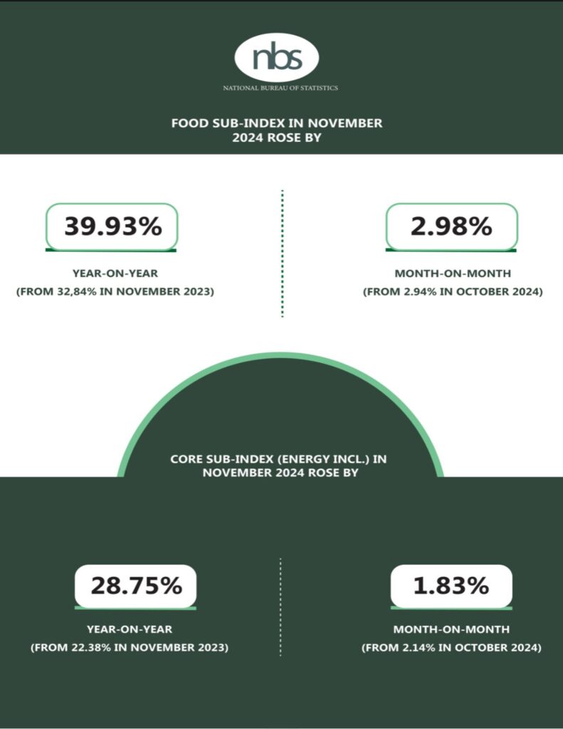The National Bureau of Statistics (NBS) has reported that Nigeria’s headline inflation rate rose to 34.60% in November 2024, marking an increase from the 33.88% recorded in October 2024.