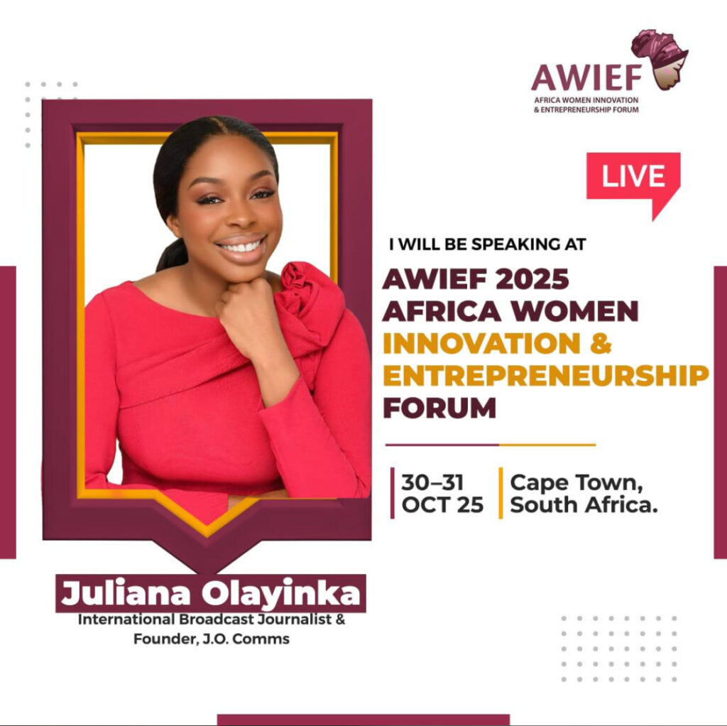 Renowned international broadcast journalist and founder of J.O. Comms, Juliana Olayinka, has been announced as one of the distinguished speakers at the Africa Women Innovation & Entrepreneurship Forum (AWIEF) 2025. The high-profile event, scheduled for October 30–31, 2025, will take place in Cape Town, South Africa, bringing together visionary women leaders, entrepreneurs, and changemakers from across the continent.