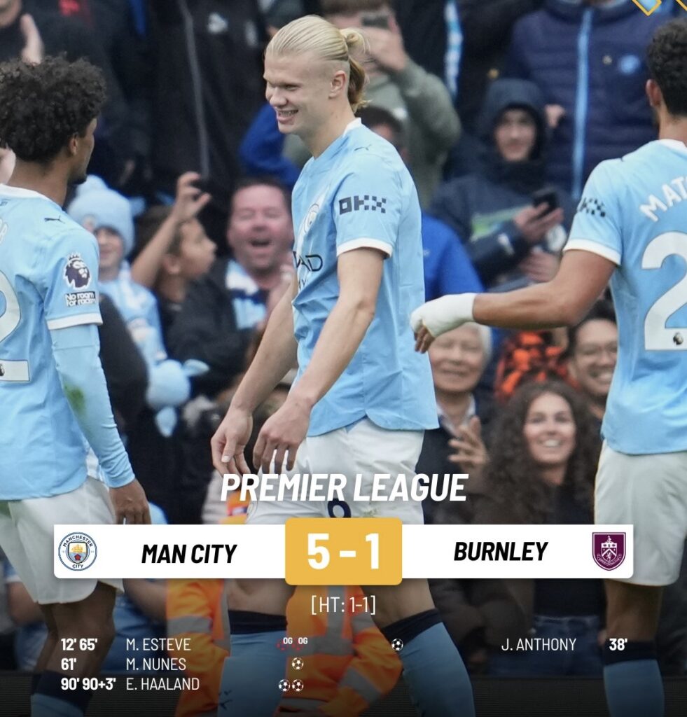 Pep Guardiola’s men emerged transformed after the restart. Matheus Nunes and Oscar Bobb struck in quick succession to restore control, before Nathan Aké and Phil Foden extended the lead in ruthless fashion. Late on, Erling Haaland put the icing on the cake with a clinical brace, crushing any hope of a Burnley comeback.