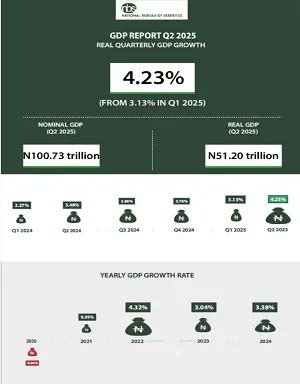 Nigeria’s GDP Rises to 4.23% in Q2 2025, Driven by Oil and Non-Oil Sectors