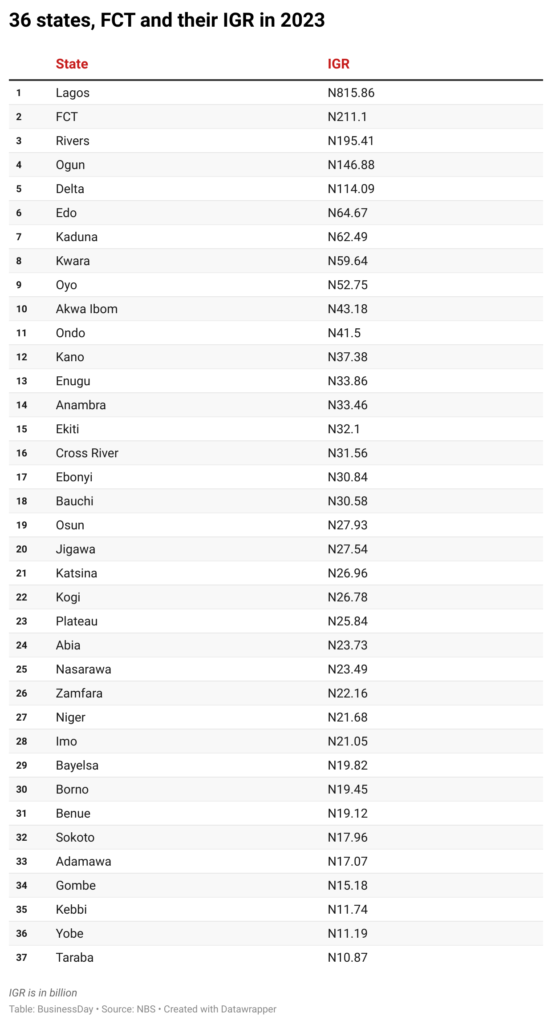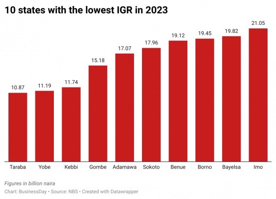Conversely, Taraba State recorded the lowest IGR in 2023, with Yobe and Kebbi also among the states generating minimal revenues.