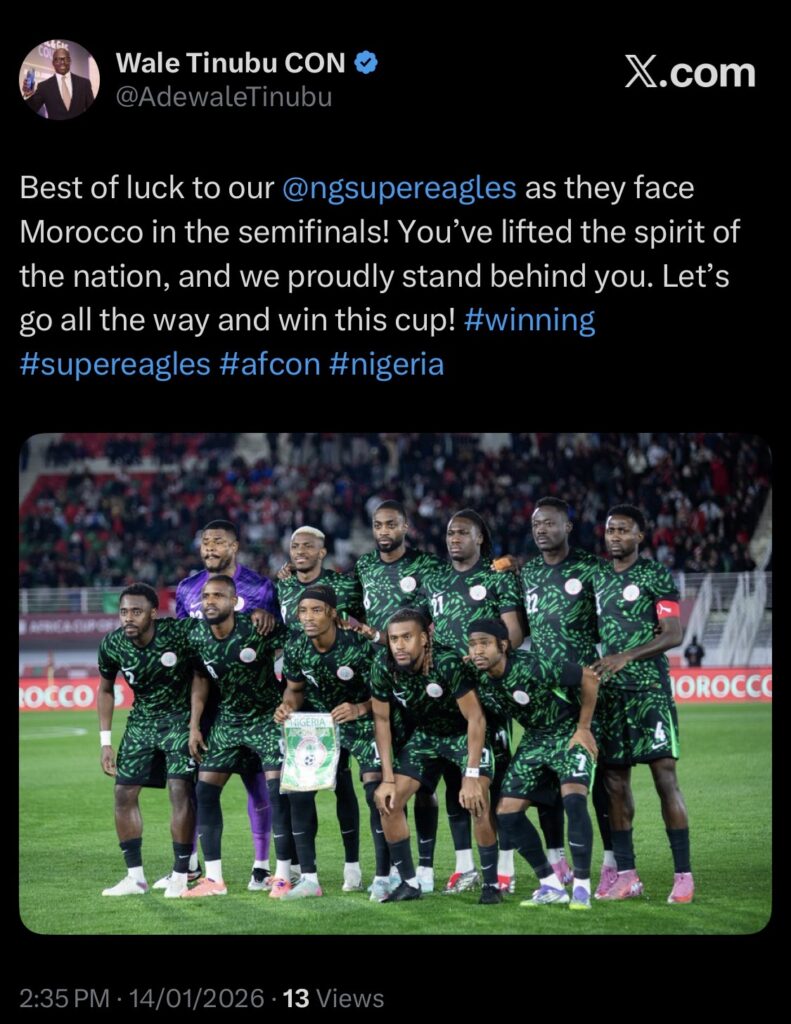 In a message shared on his official X page, Tinubu praised the national team for inspiring Nigerians with their performances so far, noting that they have reignited national pride and unity. He assured the players of the nation’s full support as they push for a place in the final.