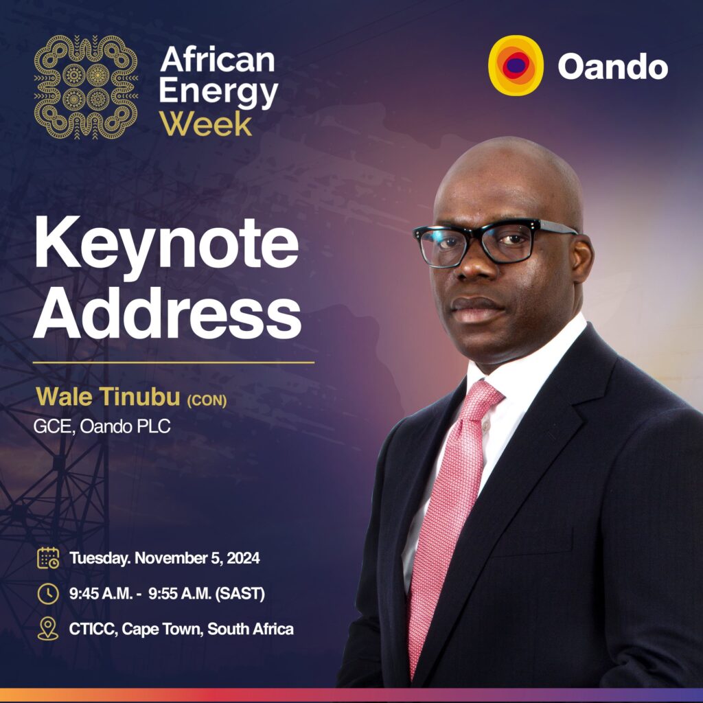 Wale Tinubu, the Group Chief Executive (CON) of Oando PLC, will be delivering a keynote address at the African Energy Week in Cape Town, South Africa. The event, scheduled for Tuesday, November 5, 2024, will see Tinubu address industry leaders and stakeholders at the Cape Town International Convention Centre (CTICC). His keynote is set to take place from 9:45 A.M. to 9:55 A.M. (SAST).
