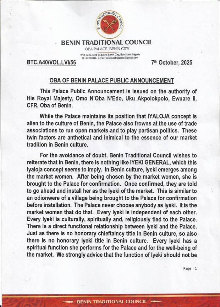 The Benin Palace has refuted claims of the existence of any title known as Iyeki General or Iyaloja within the Benin Kingdom or anywhere in Edo State, describing such positions as alien to the ancient Benin traditional system.
