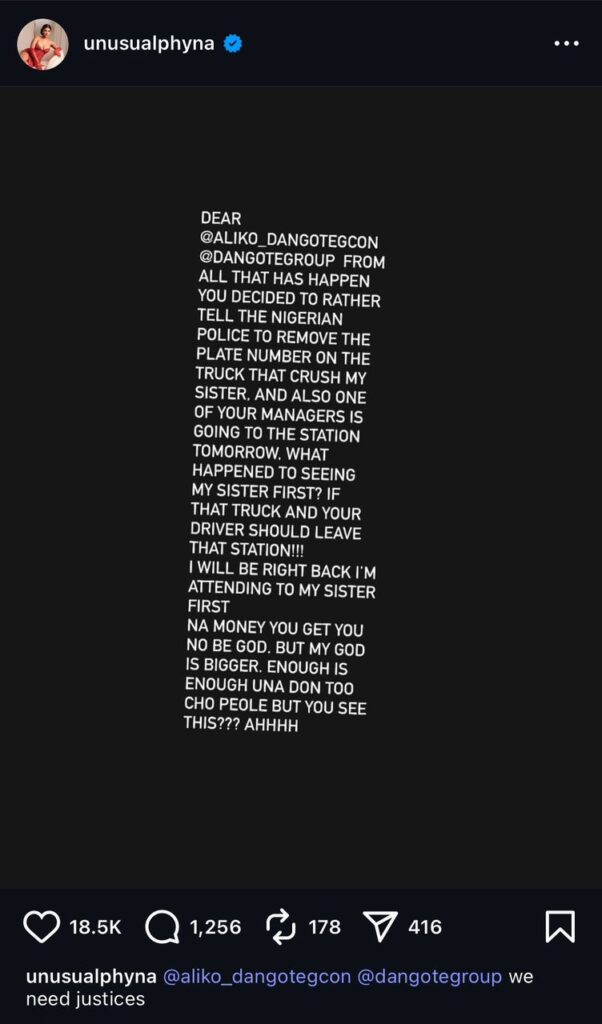 Phyna Calls Out Dangote Group After Truck Crushes Her Sister, Demands Justice!