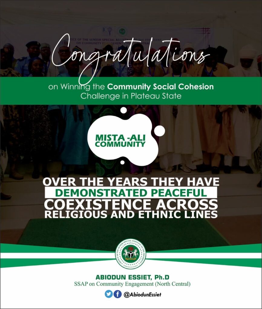 The Presidency has awarded Mista-Ali community leader, Sarki Danladi of Bassa Local Government Area, a cash prize in recognition of his outstanding commitment to peace and social cohesion.