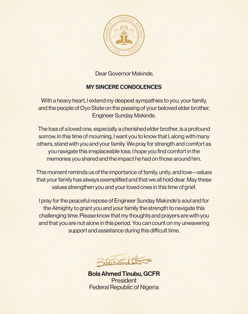 “With a heavy heart, I extend my deepest sympathies to you, your family, and the people of Oyo State on the passing of your beloved elder brother, Engineer Sunday Makinde,” the President wrote.