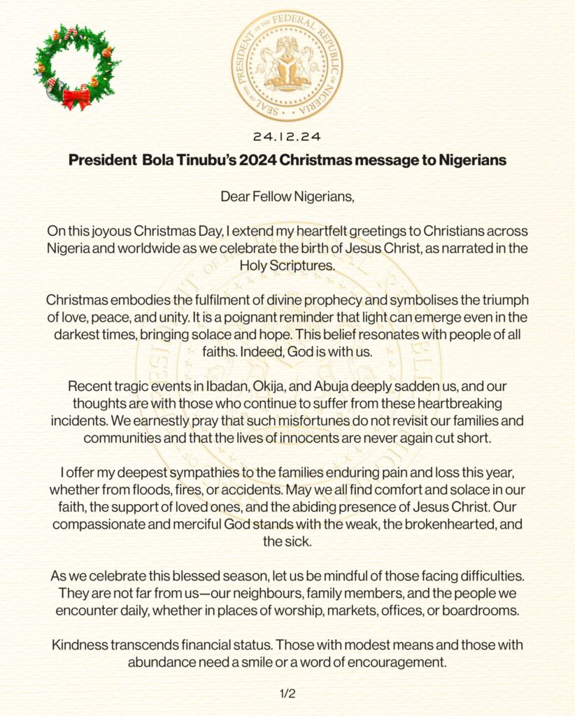The message reflects the President’s call for unity and love, encouraging all Nigerians to embody the spirit of Christmas through generosity and understanding, regardless of their circumstances.