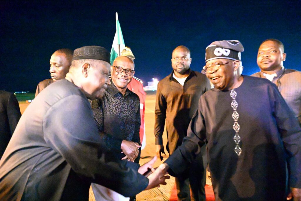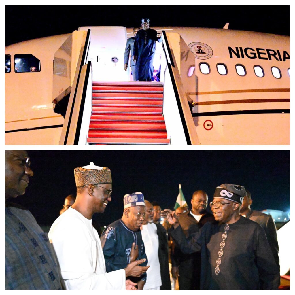 President Bola Tinubu received a warm welcome in Abuja on Sunday upon his return from London. Key political figures, including Governor Abdullahi Ganduje, Senator George Akume, House Speaker Femi Gbajabiamila, former Governor Nyesom Wike, and former Governors Nasir El-Rufai and Bello Matawalle, were present to greet him at the airport.