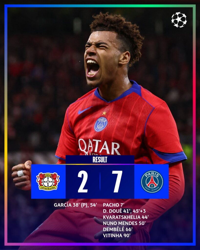Nuno Mendes, Ousmane Dembélé, and Vitinha all found the net after the break as the visitors tore through Leverkusen’s back line with ease. Even with Leverkusen making multiple substitutions, PSG’s relentless pressure proved too much to handle. The emphatic 7–2 victory not only cements PSG’s control of their Champions League group but also serves as a stark reminder of their attacking depth and intent this season.