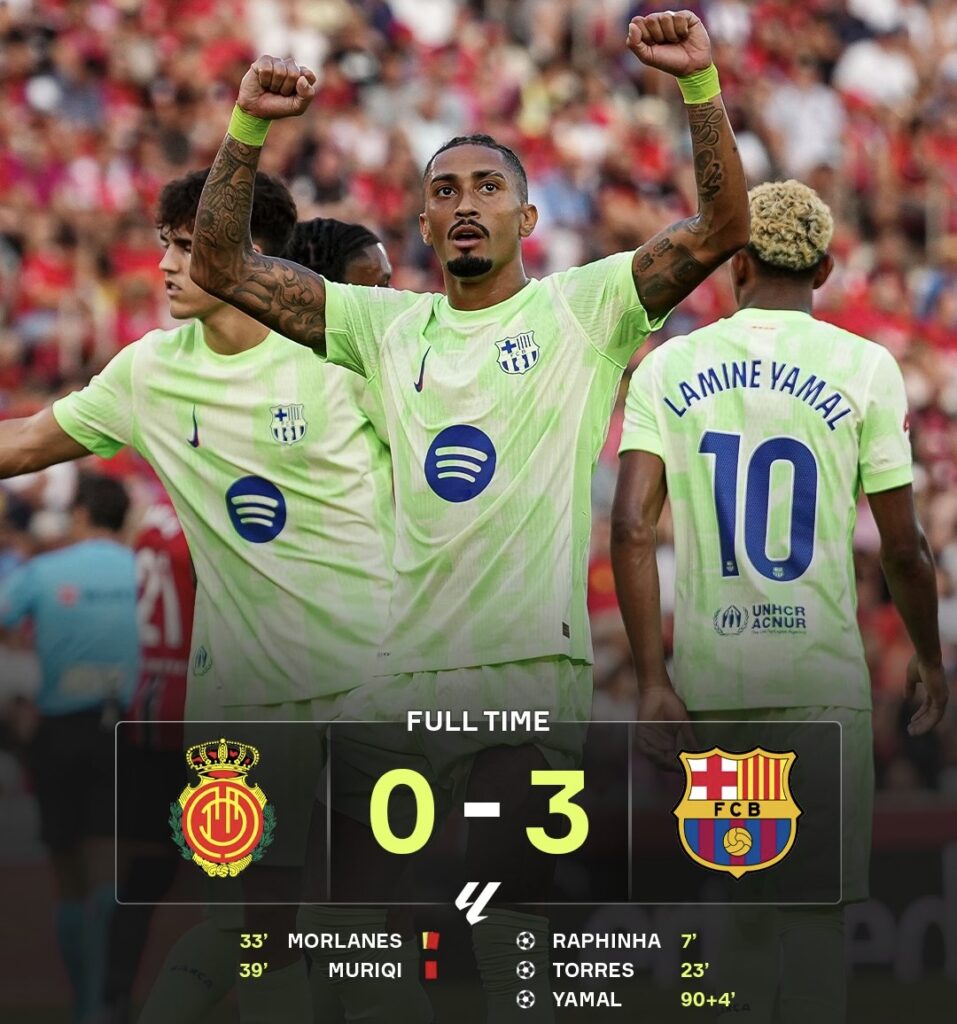 The Blaugrana wasted no time in asserting dominance, with Raphinha opening the scoring in the 7th minute after a brilliant setup from Lamine Yamal. Just 16 minutes later, Ferran Torres doubled the advantage, leaving Mallorca chasing shadows. As stoppage time approached, Raphinha struck again to seal a 2–0 first-half cushion for Xavi’s men.