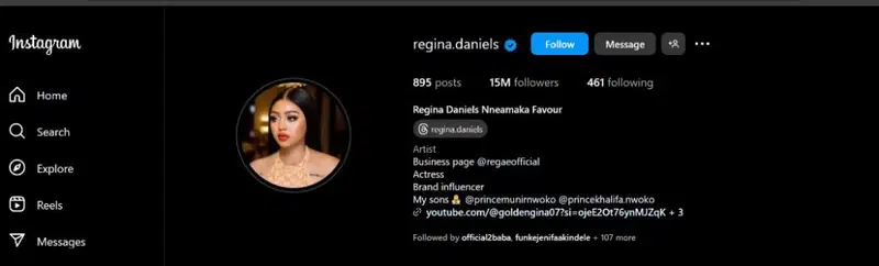 Nollywood actress Regina Daniels has returned to Instagram with some changes to her page following a briefdeactivation.