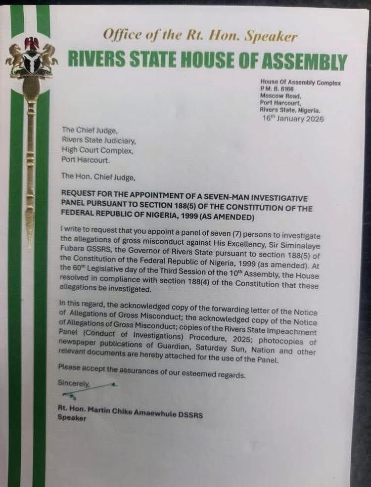 The Rivers State House of Assembly has formally written to the state’s Chief Judge, requesting the constitution of a seven-member panel to investigate allegations of gross misconduct against Governor Siminalaye Fubara GSSRS.