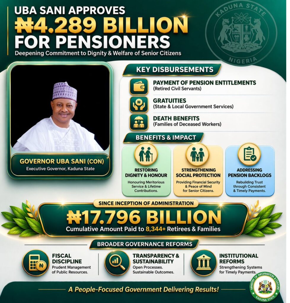 Kaduna State Governor, Senator Uba Sani, CON has approved the release of N4.289 billion for the payment of pension entitlements, gratuities, and death benefits to retired civil servants and families of deceased workers across State and Local Government services. The payment covers obligations under both the Contributory Pension Scheme (Accrued Rights) and the Defined Benefit Scheme (Death Benefits and Gratuities).