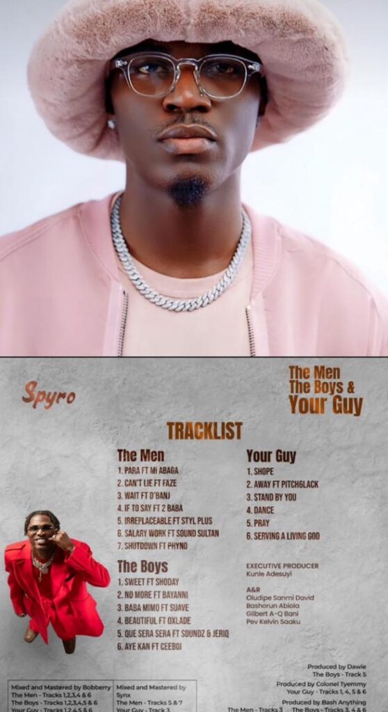 Spyro has unveiled the highly anticipated tracklist for his upcoming 3-sided album, “The Men, The Boys & Your Guy,” scheduled for release this Friday. The album promises a dynamic blend of collaborations and solo projects, highlighting the evolution of Nigerian music across generations.
