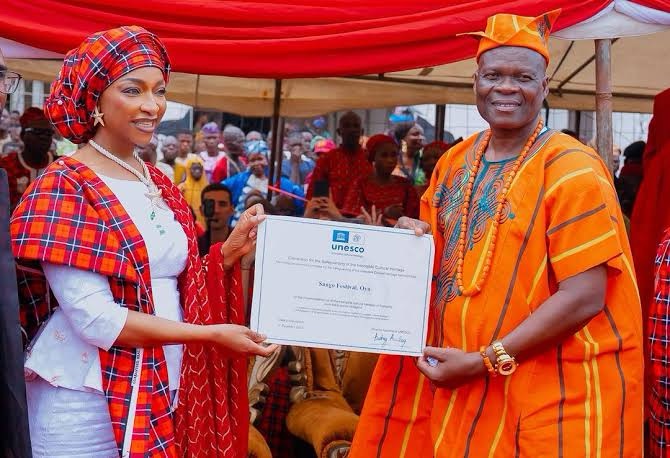 On August 16, 2025, the Sango Festival in Oyo State, Nigeria, received official recognition from UNESCO as an Intangible Cultural Heritage of Humanity. The Minister of Art, Culture, Tourism, and the Creative Economy, Barr. Hannatu Musa Musawa, presented the UNESCO World Heritage Certificate to His Imperial Majesty, Oba Abimbola Akeem Owoade, the Alaafin of Oyo, during the grand finale of the festival.
