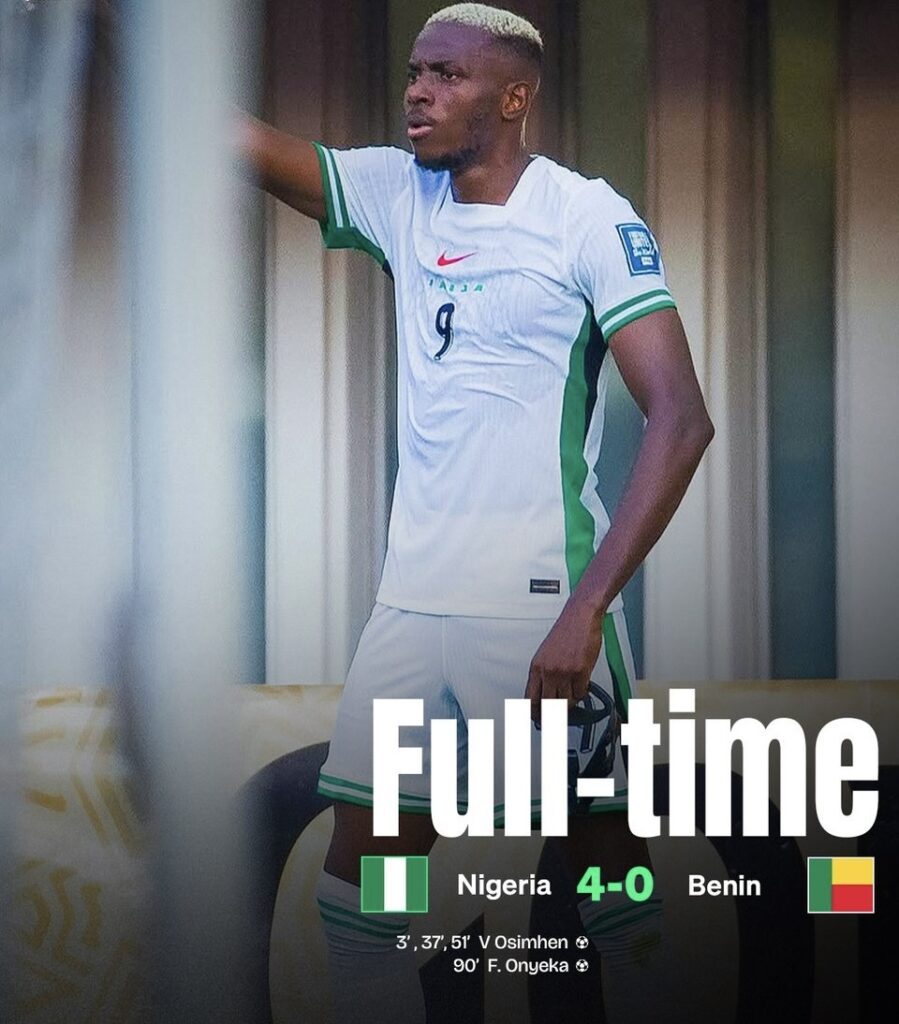 Victor Osimhen delivered a breathtaking performance on Tuesday evening, netting a sensational hat-trick as Nigeria’s Super Eagles cruised to a commanding 4–0 victory over Benin in their World Cup qualifying clash.