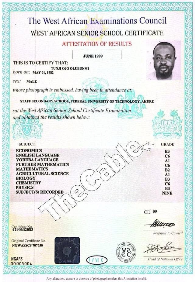 The West African Examinations Council (WAEC) has authenticated the West African Senior School Certificate Examination (WASSCE) result of Olubunmi Tunji‑Ojo, Minister of Interior. The attestation confirms that Tunji‑Ojo attended Staff Secondary School at the Federal University of Technology, Akure, and sat the examination in June 1999. The document bears his full name, date of birth, original certificate number, embossed photograph and official WAEC authentication markings.