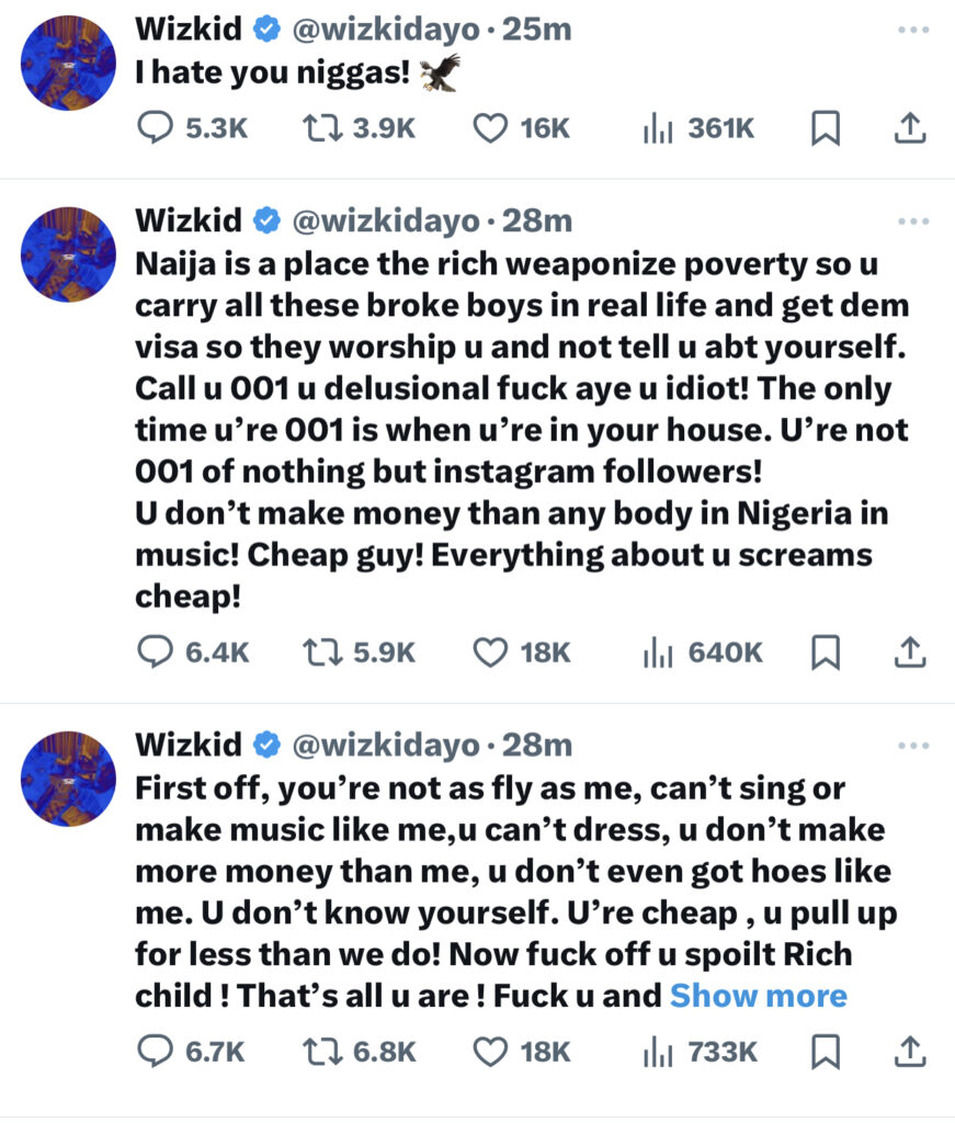 Wizkid’s tirade began with a blunt statement, “I hate you niggas!” followed by a detailed attack that questioned Davido’s authenticity and financial success in the industry. He accused Davido of using wealth to exploit the less privileged, stating, “Naija is a place the rich weaponize poverty,” and added that Davido only enjoys a social status of “001 of nothing but Instagram followers.”