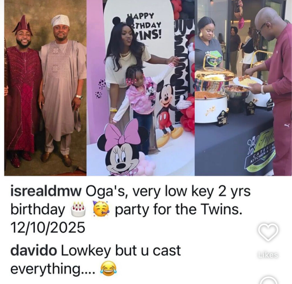 Afrobeats superstar Davido has playfully reacted after his longtime aide, Israel DMW, shared several videos from the singer’s twins’ second birthday celebration held in Atlanta, USA. The social media buzz began when Israel posted clips showing glimpses of the lavish family event, drawing warm reactions from fans — and a humorous response from Davido himself, who commented, “You cast everything.”